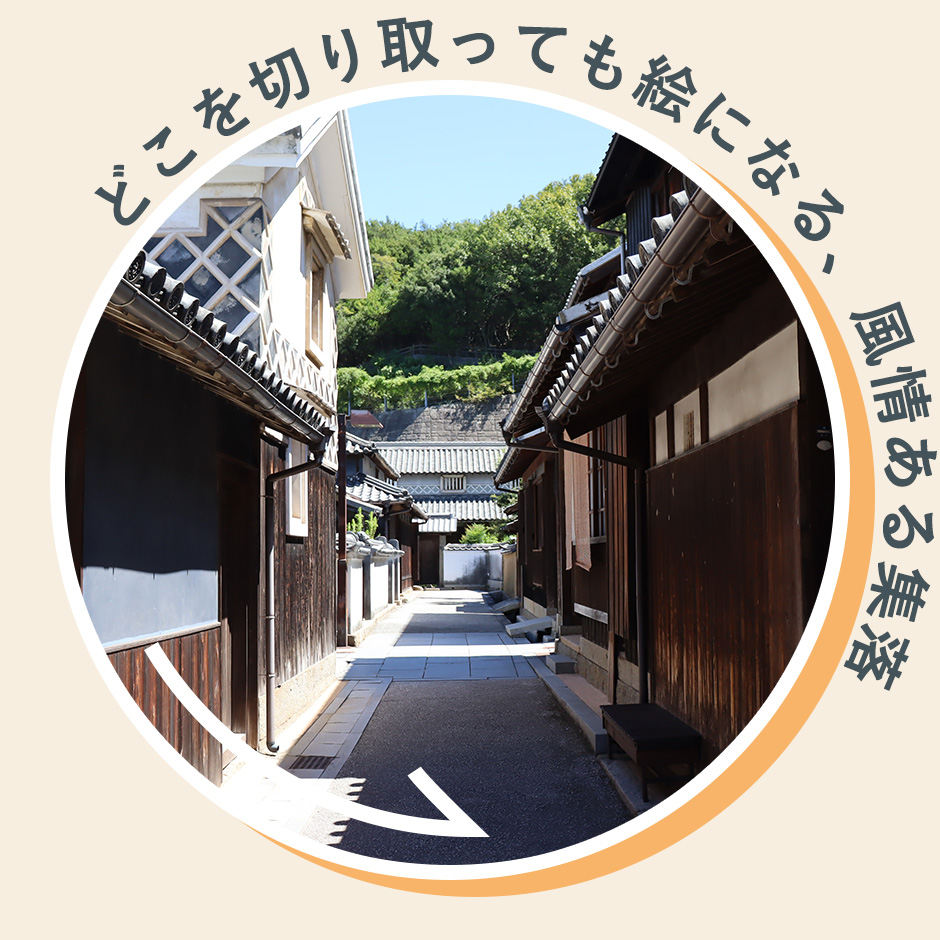 本島の島内アクセスは徒歩・レンタサイクル・バスです。レンタサイクルは本島港すぐの待合所や一部の飲食店で借りることができます。数に限りがあるため利用したい場合は早い時間の船で行くのがおすすめです。主要スポットの「笠島まちなみ保存地区」までは約1.8km、「塩飽勤番所跡」までは約800m、「木烏神社(千歳座)」までは約450m。道中にアート作品も点在していて、徒歩で巡ることも可能です。島内の道路はバスや車が通行するため、レンタサイクルなどは交通ルールを守ってご利用ください。