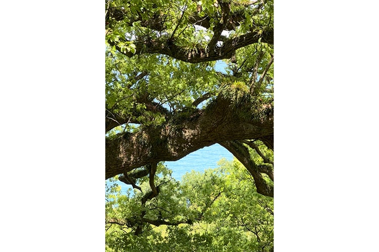 港から集落を抜け、山あいの坂道を歩いて約20分。山道を曲がると、地上近くから四方に力強く幹が伸び広がる、力強い姿が現れます。高さは約40メートル、周囲は約14メートルもあり、大楠の生み出す神秘的な世界に身も心もすっぽりと包み込まれます。葉の揺れる音を聴きながら、枝の隙間に瀬戸内海の青色をのぞむ景色は、映画や絵本の世界に迷い込んだよう。7月中旬には足元にウバユリが咲き誇り、より一層神聖な空気に包まれます。道中には案内板があり迷わず行けますが、傾斜のきつい場所があるため動きやすい服装がおすすめです。さらに進むと「楠の倉展望台」があり、眼下には大楠とともに、穏やかな瀬戸内海と多島美を望むことができます。