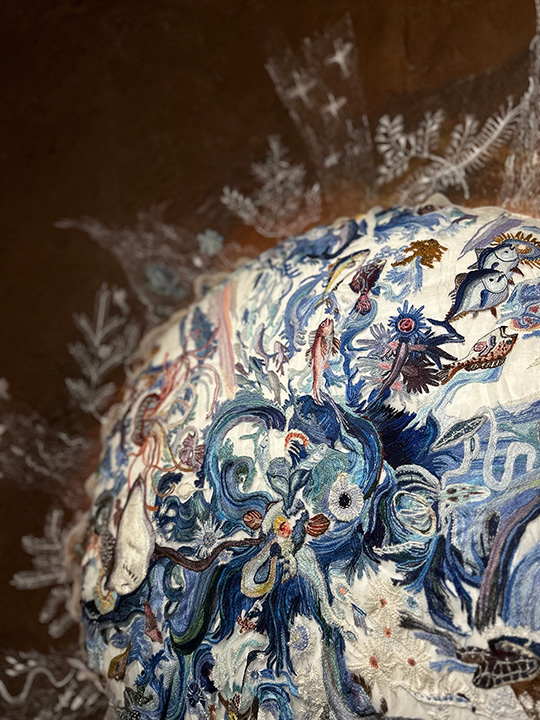 アート初心者だった島の人たちも、作品制作を手伝ううちにみるみると秘めたる才能が開花。過去に粟島で滞在制作をしたアーティスト、大小島真木さんとインド人の少数民族・ワルリ族出身のマユール・ワイエダさんの作品制作では、クジラの心臓や魚の群れのモチーフを島のお母さんたちが何カ月もかけて刺繍しました。その繊細で緻密な表現力は、アーティストもお客さんも驚くほどです。