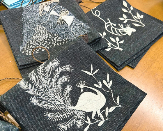 そんな刺繍の腕を生かして島の女性たちが作り続けているのが、粟島芸術家村のお土産「刺繍サコッシュ」。マユール・ワイエダさんの作品をモチーフに、一つひとつ島のお母さんたちが手作りした、世界に一つだけのお土産です。毎週土曜日の午後に粟島芸術家村に集まって、ボランティアで制作しています。